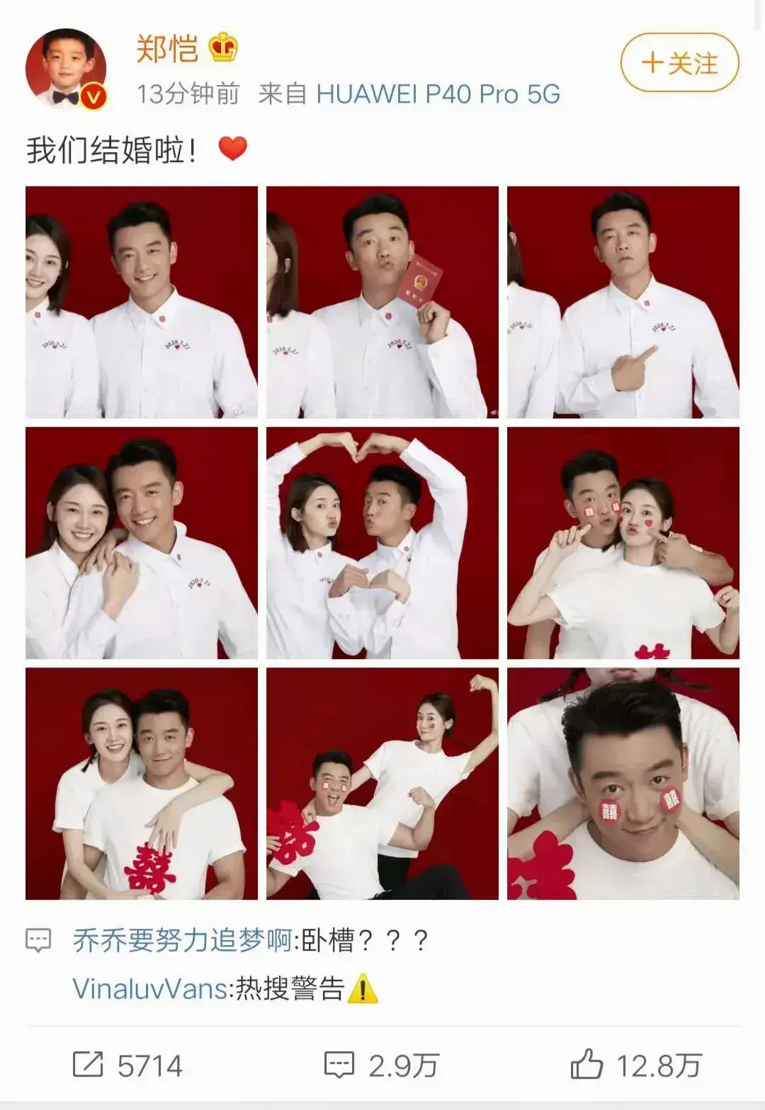 再到后来,两个人结婚的消息瞬间引爆了网络,两人不声不响,悄悄地直接甩出了结婚照,还特别用心的把时间卡在了“5201314”,这颗糖的甜度着实是甜炸了。