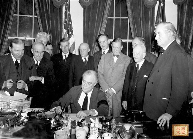 在被日本偷袭之后,上图是时任美国总统罗斯福签署对日宣战书,美国开始参战。总统的手臂上系着代表哀悼的黑纱,而总统身后的白宫官员的表情很精彩,有的跃跃欲试,有的满面愁容,看来美国的官员也是有喜欢打仗的啊。