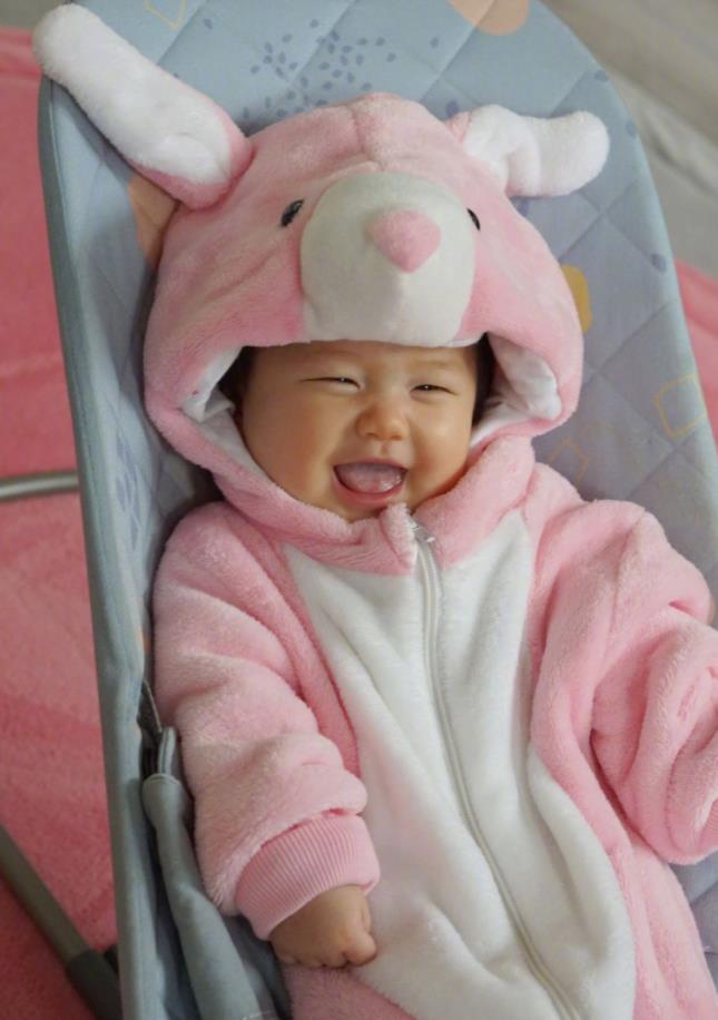 在另一张照片中,小宝宝穿着婴儿服,头上将可爱的帽子戴起来,趴在毛茸茸的地毯上,嘴巴微张,满眼好奇的盯着镜头,这也是她最可爱的一张照片了,真是萌化众人的心呀,又在骗人生女儿,不过这么小都这么可爱,看来是继承了妈妈的好基因,想来长大后也是一位大美人了。
