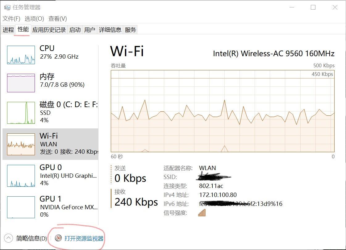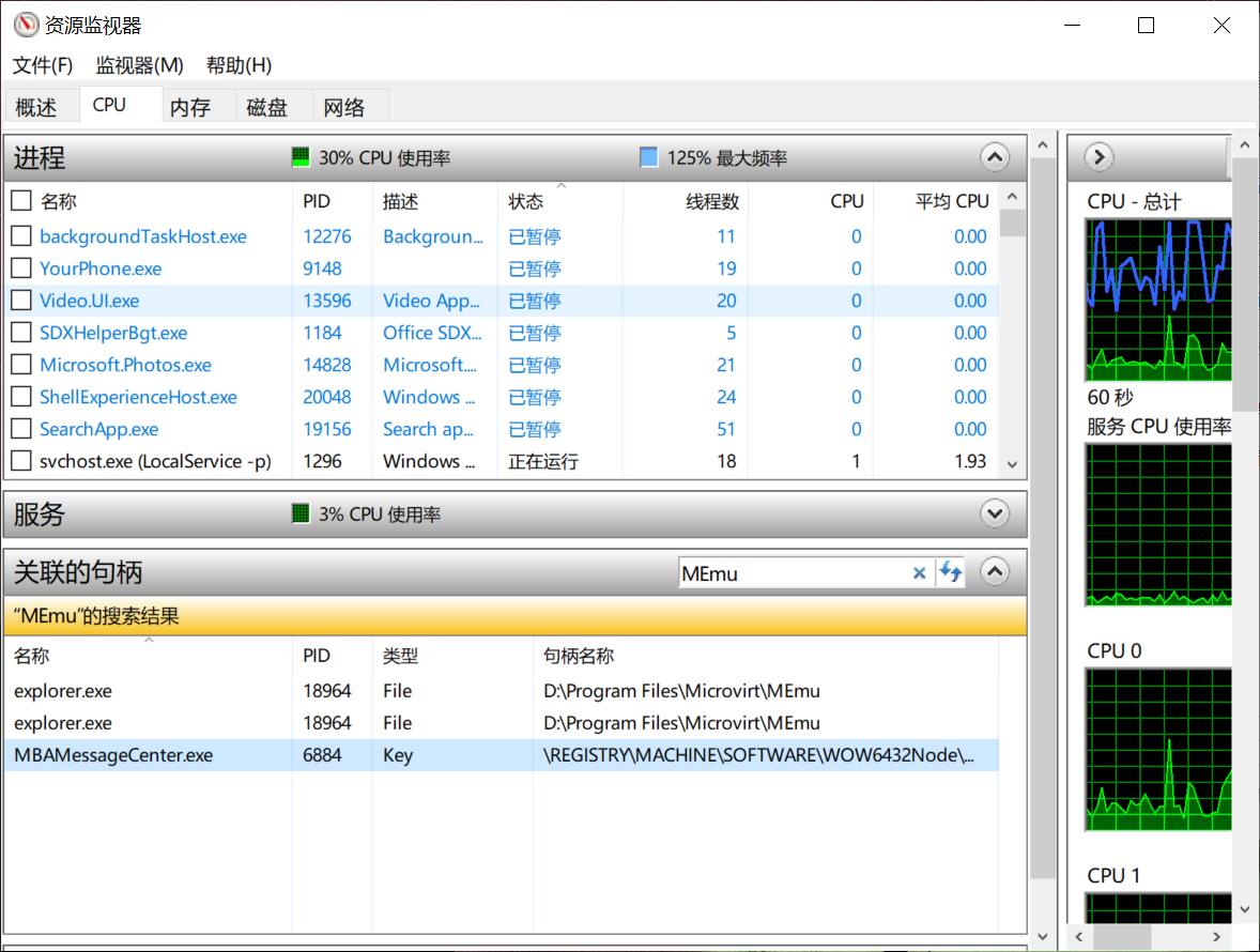 3.如果在任务管理器中没有找到相关进程,在任务管理器中点击 性能 -> 打开资源管理器->CPU,在关联的句柄栏输入上面xxxx处的名称,搜索出占用文件的进程,如有则选中进程右键关闭进程,再尝试操作文件;