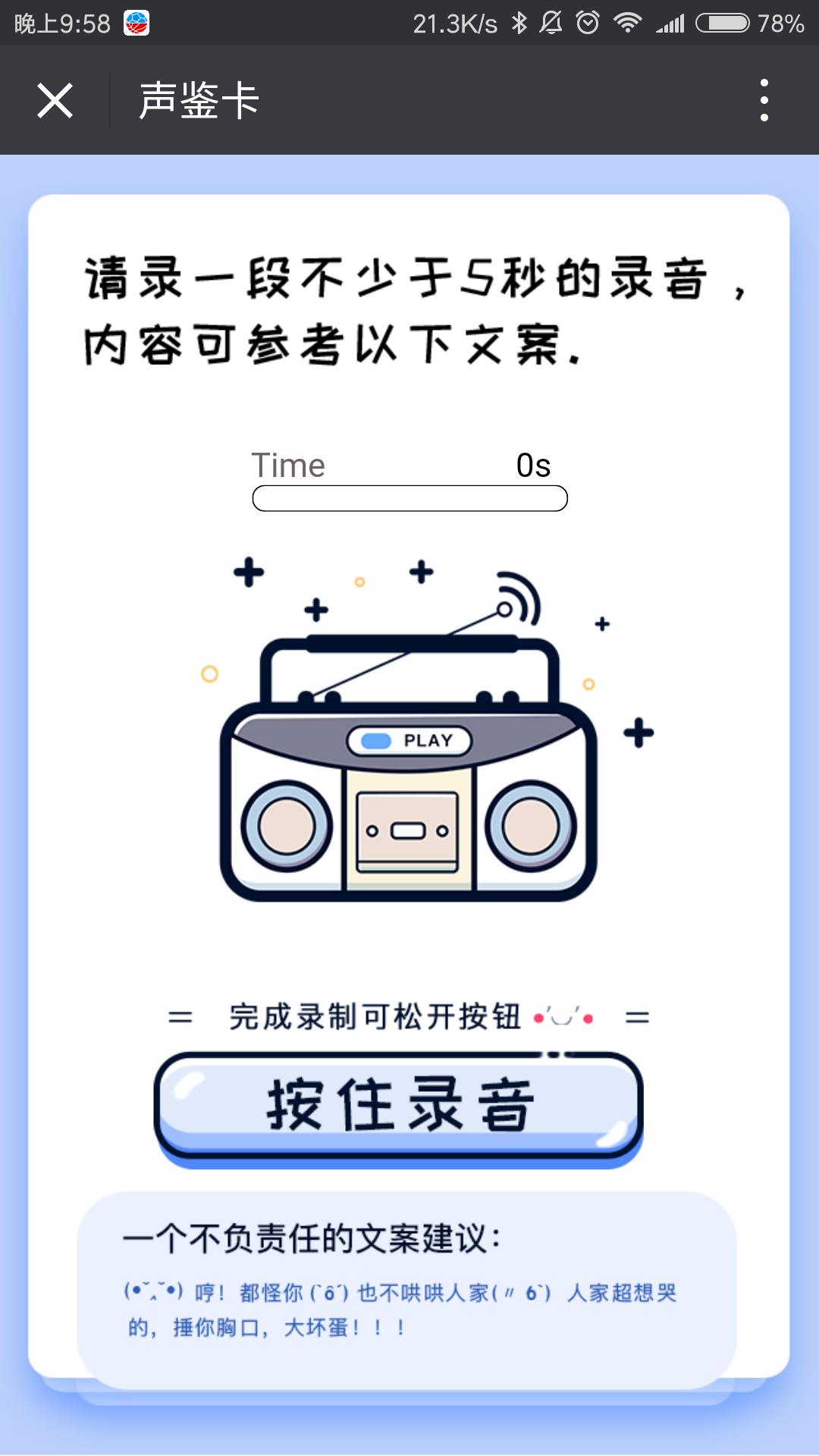 点击文字链接即可进入“声鉴卡”的测试页面,具体操作步骤如下。