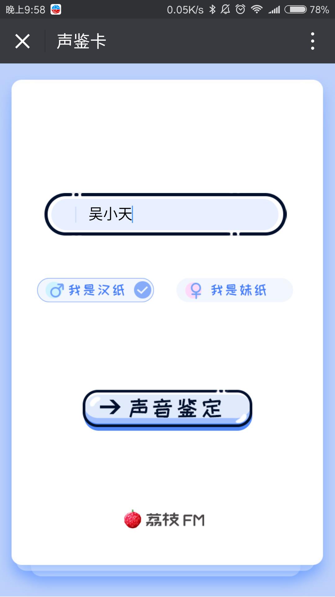 进入后可以看到测试界面,输入姓名,选择性别即可,点击“声音鉴定”即可进入下一步。
