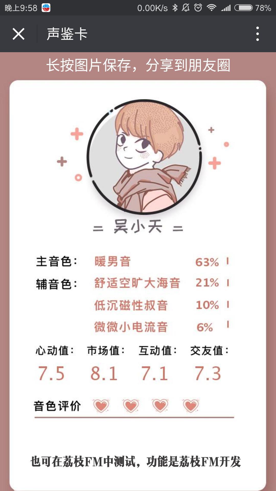 就可以看到声鉴卡的测试结果,非常的个性化,卡片也比较精美,对声音以及各项值有详细介绍,可以直接分享给朋友,邀请朋友一起测试~