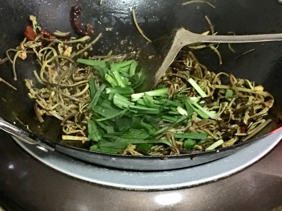 4、炒至7成熟时,加入韭菜段继续翻炒。