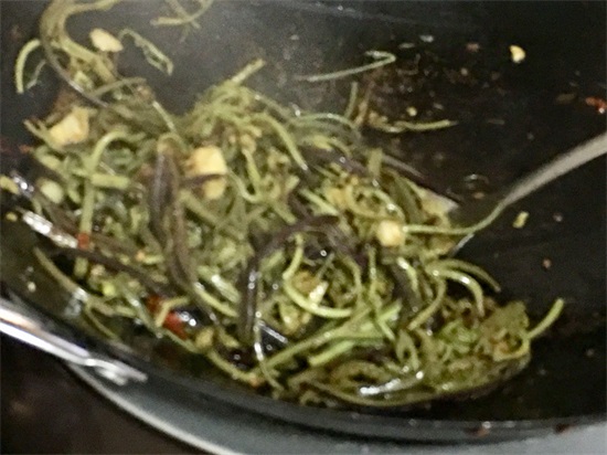 5、炒至韭菜断生,加入适量食盐调味后,关火就出锅装盘。一道非常美味的辣酱爆炒龙爪菜就完成了。(全程大火)