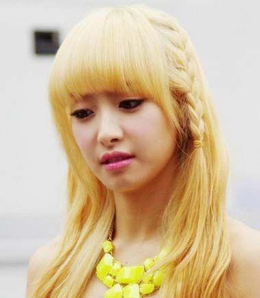 小仙女一样的编发发型,金黄色的头发处处都透着可爱公主的感觉,将发顶上的头发梳的微微靠前一些,发型拢在肩膀上,两个编发搭配着精致的齐刘海,展现了大脸女生多发量的发型优势。