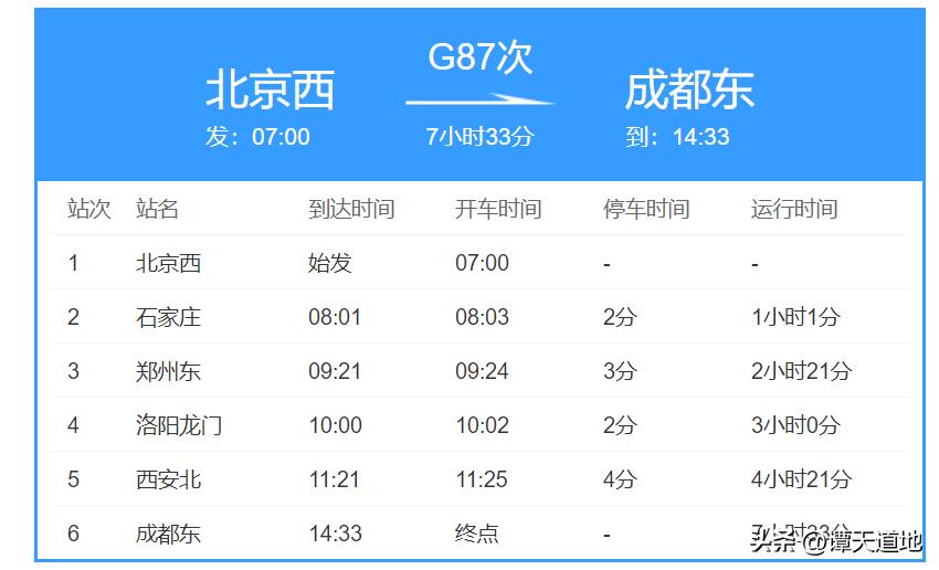 因为这趟列车,全程只有6站,请看上图,上图为G87次列车的所有站点,分别为:北京西站、石家庄站、郑州东站、洛阳龙门站、西安北站、成都东站。
