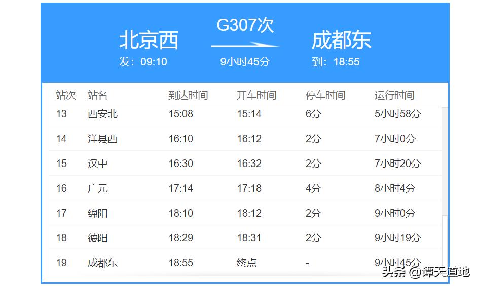 从图中,我们不难看出,G307次列车,始发站是北京西站,终点站是成都东站,一趟下来,全程耗时是9小时45分。