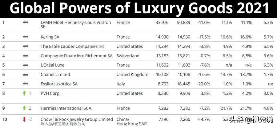 全球前十大奢侈品公司:中国企业上榜,爱马仕排第9,香奈儿排第6