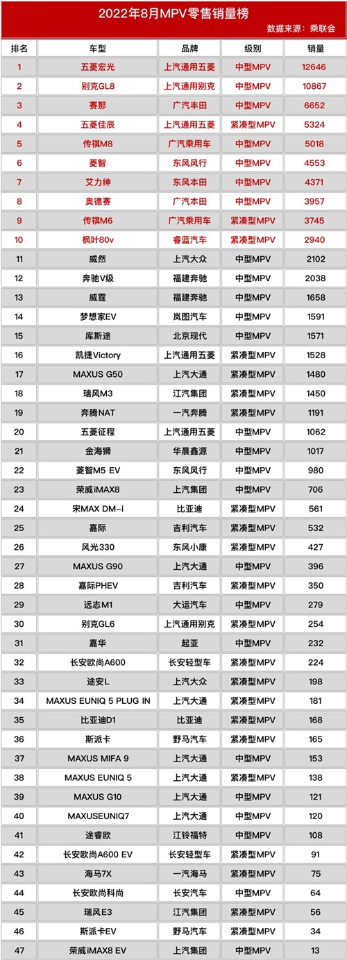纵观整个MPV市场,前三的排名保持不变,依旧是五菱宏光、别克GL8、丰田赛那。但五菱佳辰销量环比增长,取代传祺M8位居第四;传祺M8和M6分别排名第五和第九;艾力绅和奥德赛分别排名第七和第八;枫叶80V稳居第十。具体排名如下: