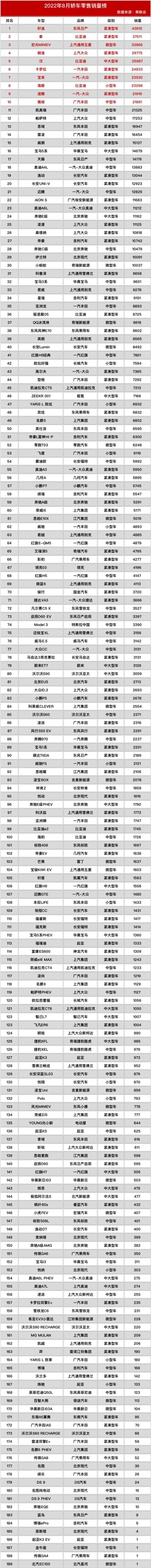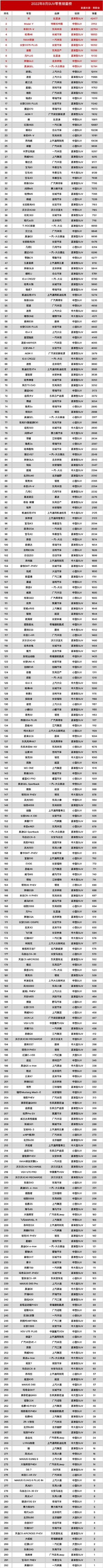 8月全国汽车销量排行榜