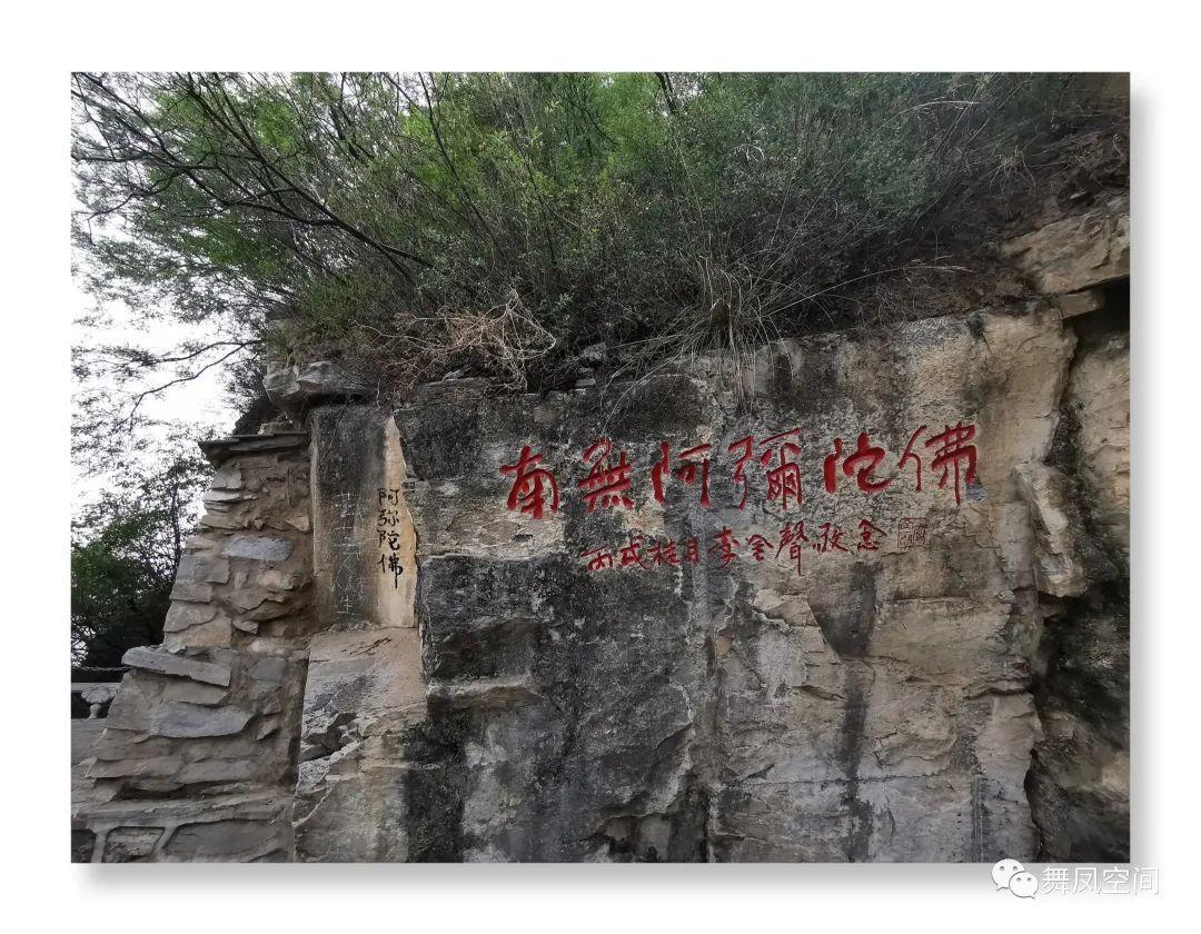 往下行,山崖上有字“南无阿弥陀佛”。此处为佛岩山,因山崖上刻有连山石佛一尊而得名。当人们跪在佛前礼拜时,抬眼可见佛在微笑,因此又称“佛岩垂笑”。