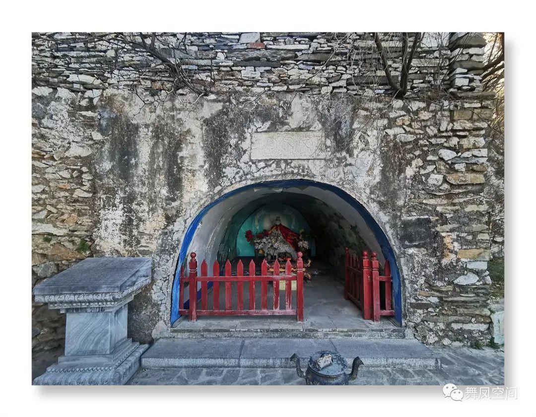 继续往下走,路途有些崎岖,到了一处平台,山石中夹着一处建筑,关公洞,洞外有佛龛和石碑。洞内正中供关羽,相传关羽曾避难此洞,日以卖枣为生,后为山下百姓除灭盗匪,由此受到敬仰供奉。