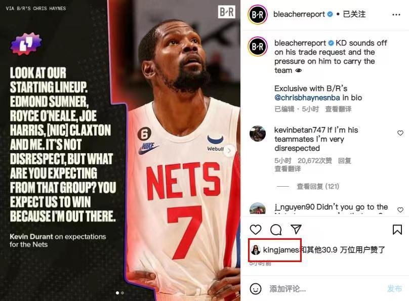 加上西蒙斯在新赛季的表现不佳,到替补席担任领袖后也无法改变篮网的局面,杜兰特也感到非常无奈。这不?在接受著名记者Haynes的采访时,他更是表态球队的首发阵容没有任何令人期待的地方,大家觉得球队能够赢球是因为有他的存在。恰巧的事情是,当BR记者晒出杜兰特这个言论时,詹姆斯点赞了这条社交动态,想来也能够对杜兰特的遭遇感同身受。