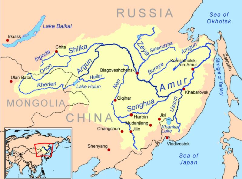 阿穆尔语(俄语:река́ Аму́р,IPA:[ɐˈmur])或Heilong Jiang(中文:黑龙江;拼音:HēilóngJiāng,“黑龙河”,IPA:[xéi.lʊ̌ŋtɕjáŋ]),[2]是世界 第十条最长的河流,形成了俄罗斯远东地区与中国东北地区(内蒙古)的边界。 阿穆尔河长2,824公里(1,755英里),流域面积为1,855,000平方公里(716,000平方英里)。[1] [3] 包括其源头河Argun在内,它的长度为4,440公里(2,760英里)。[3] 阿穆尔海域最大的鱼类是卡卢加鱼,其长度可达5.6米(18英尺)。[4] 流域是各种大型掠食性鱼类的家园,例如北方蛇头鱼,阿穆尔派克鱼,泰门鱼,阿穆尔猫鱼,掠食性鲤鱼和黄颊鱼,[5]以及最北端种群的阿穆尔软壳龟[6]和印度荷花。 。[7]