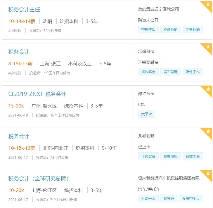 目前在招聘网站上,税务会计的薪资均在1万以上,而且很多500强企业明确提出该岗位“税务师优先”。