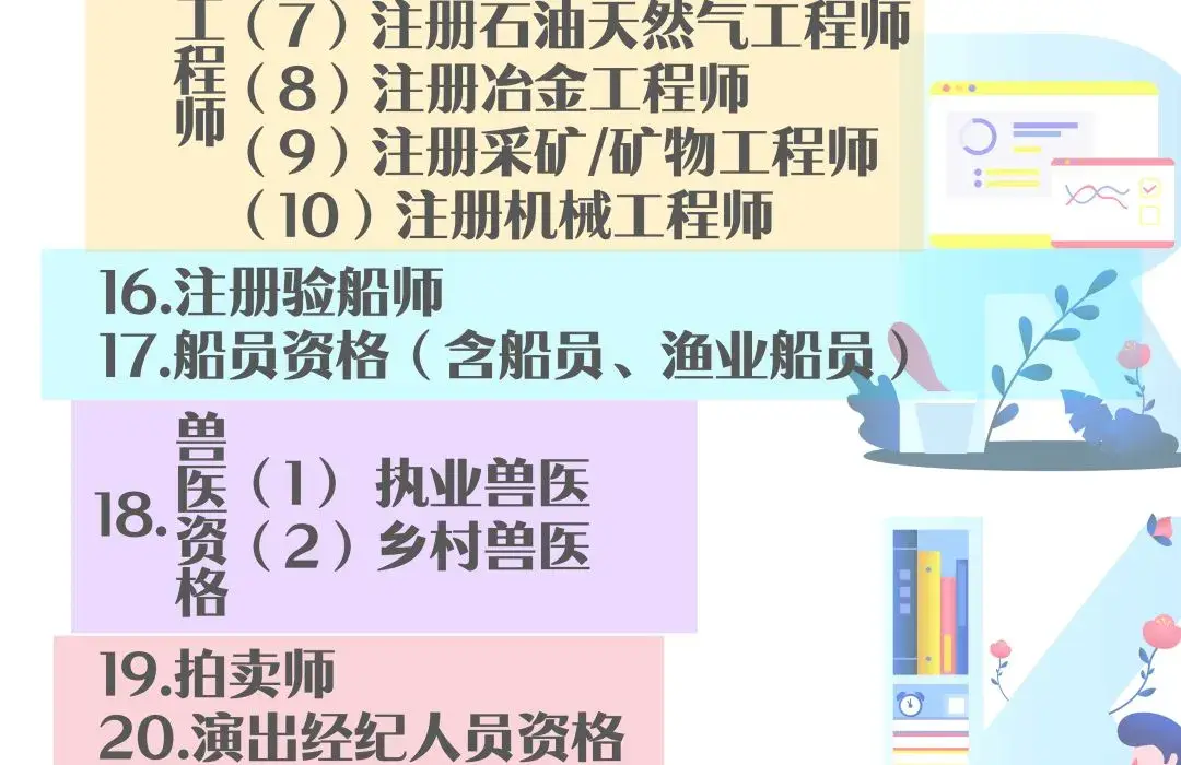 按照国家职业资格目录,准入类专业技术人员职业资格仍有35项,准入类技能人员职业资格仍有5项。下面这40项职业资格具有较高的含金量!