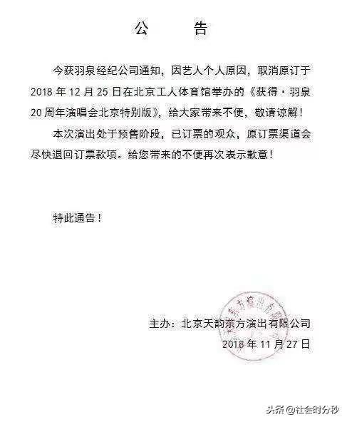 事实上,陈羽凡吸毒的消息在昨天就已经被侧面证实了,11月27日,羽泉年底的演唱会主办方——北京天韵东方演出有限公司发布公告称:今获羽泉经纪公司通知,因艺人个人原因取消原定于2018年12月25日在北京工人体育馆举办的《获得·羽泉 20周年演唱会北京特别版》,给大家带来不便,敬请谅解。本次演出处于预售阶段,已订票的观众,原订票渠道会尽快退回订票款项,给您带来的不便,再次表示歉意。随后,大麦网的退票渠道也已经开启。