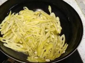 3、锅中放油,油热后放入佐料和切好的狗儿豆翻炒