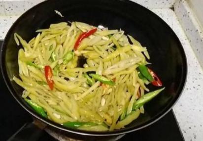 4、再依次放入仔姜,辣椒翻炒至断生