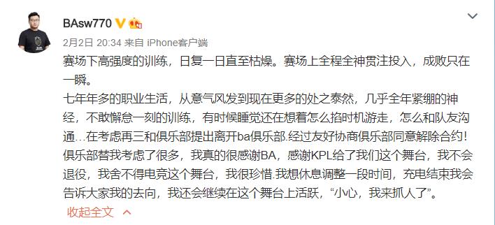 俱乐部替我考虑了很多,我真的很感谢BA,感谢KPL给了我们这个舞台,我不会退役,我舍不得电竞这个舞台,我很珍惜.我想休息调整一段时间,充电结束我会告诉大家我的去向,我还会继续在这个舞台上活跃,“小心,我来抓人了”。”