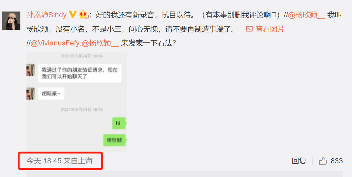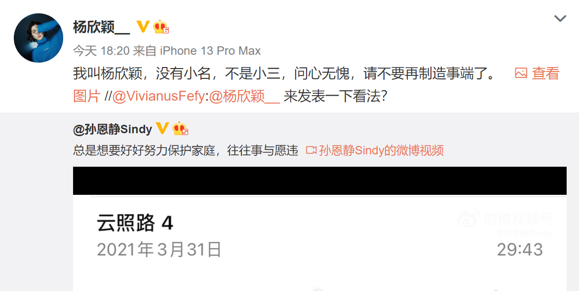 然而,当事人之一的杨欣颖,突然在晚些时候转发并开始硬刚,她转发了孙恩静这一段录音微博,否认自己是小三,还喊话孙恩静表示:“问心无愧,请不要在制造事端了。”