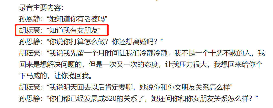 大意就是两人协商该如何处理这一段关系,胡耘豪还说自己已经删除杨欣颖了,孙恩静质问胡耘豪“她知道你有老婆吗”,胡耘豪巧妙地避开,说“知道我有女朋友”,EMMM……有老婆了还说自己只是有女朋友,真会玩啊。