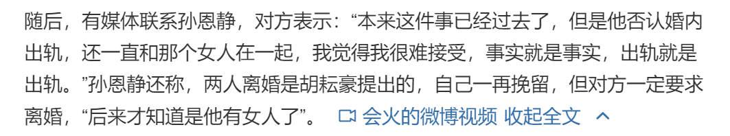 针对这一场出轨风波,有媒体联系到了孙恩静,她表示:“本来这件事已经过去了,但是他否认婚内出轨,还一直和那个女人在一起,我觉得我很难接受,事实就是事实,出轨就是出轨。”孙恩静还称,两人离婚是胡耘豪提出的,自己一再挽留,但对方一定要求离婚,“后来才知道是他有女人了”。