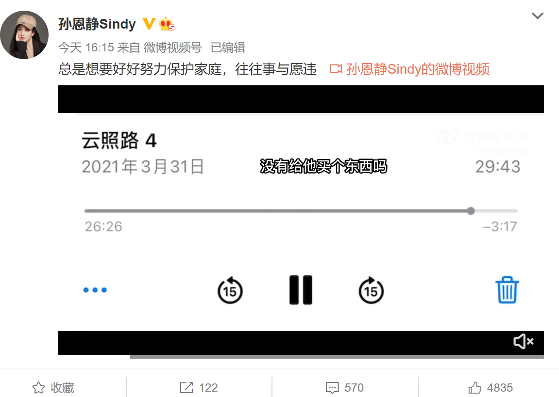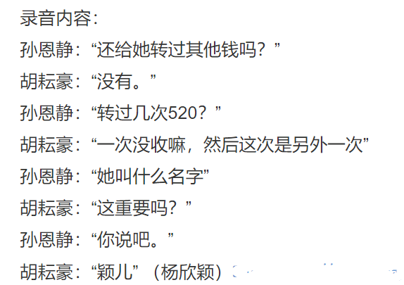 果然,孙恩静正面开怼前夫,她先是发了一段录音,表示自己“总是想要好好努力保护家庭,往往事与愿违”,随后配上一则与胡耘豪私下录音的视频。胡耘豪在录音中承认表示,给女方(小三)转过一次520。