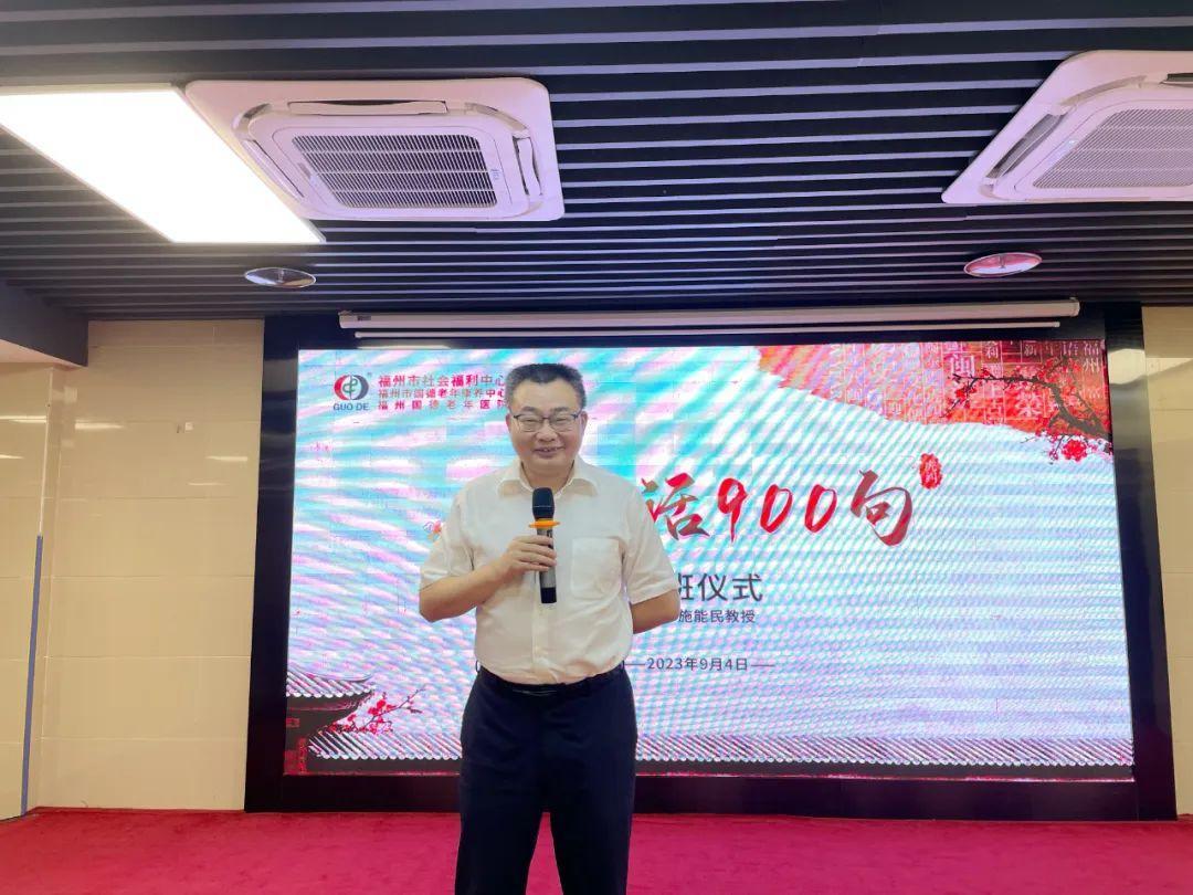 为了提高护理员的福州话水平,加强与长者的沟通能力,使他们能够在养老照护中使用福州话与长者们进行交流,福州市国德老年康养中心特邀施能民教授倾情加入,于9月4日举办“福州话900句”课堂开班仪式,为康养中心全体护理员开展福州话教学活动,国德集团董事长郑新国、福州市国德老年康养中心执行院长陈云出席本次仪式并讲话。