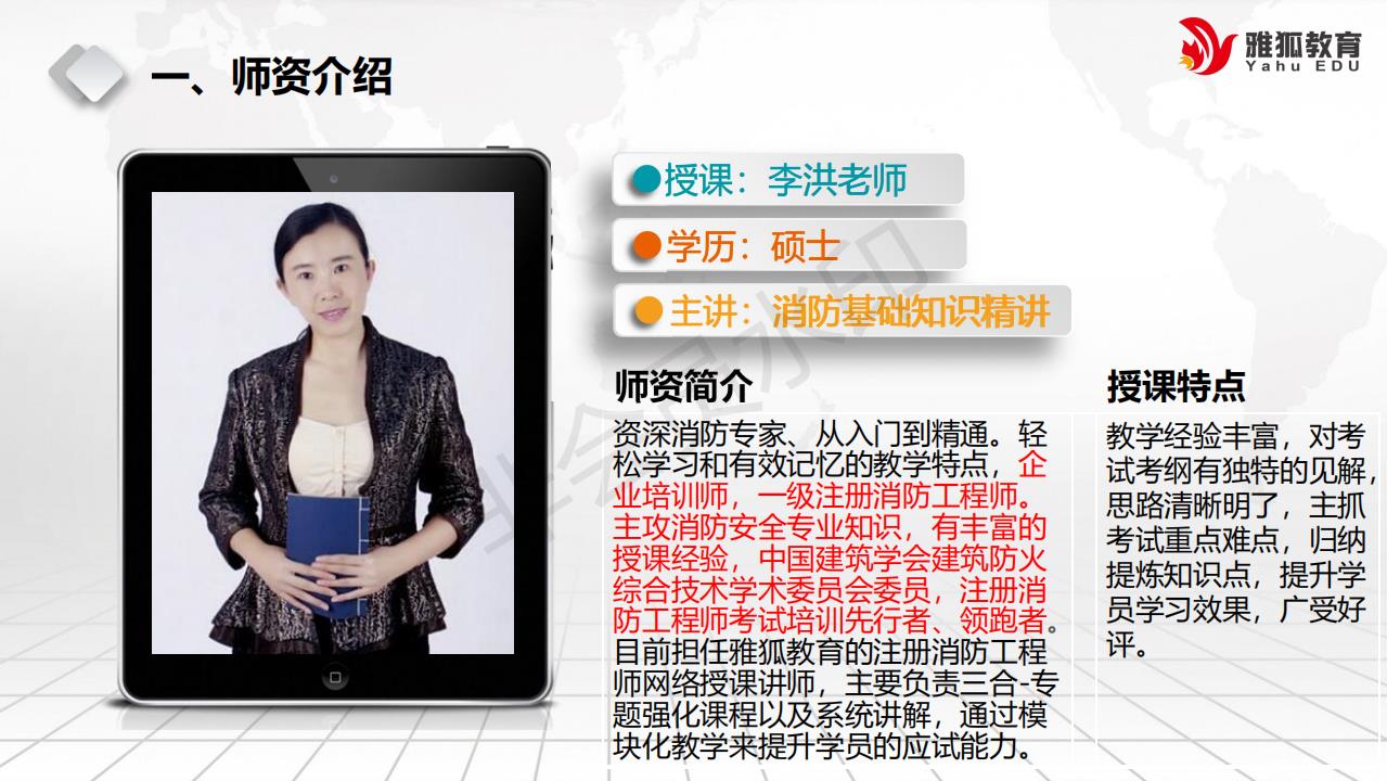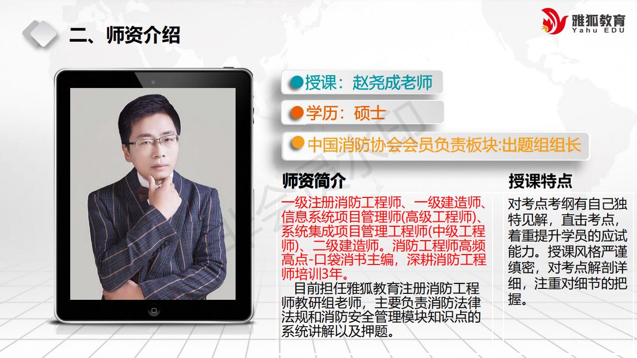 注册消防工程师、注册安全工程师、注册一二级建造师主讲教师,高级工程师,风险管理体系高级审核员,同时讲授一级注册消防工程师全3科和注册安全工程师全4科课程。张老师授课思路清晰,采用提出“模块化教学方法”讲授消防工程师,提出以“案例分析”为复习主线的“七步法”思路。具备消防现场的相关经验,唯一不足是普通话不太标准,带口音。