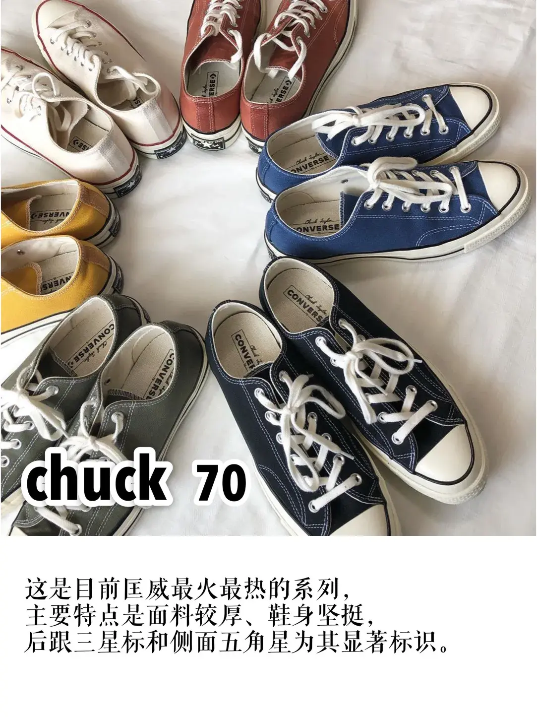 ② chuck 70,这是目前匡威最火最热的系列,主要特点是面料较厚、鞋身坚挺,后跟三星标和侧面五角星为其显著标识。1970s为这个系列的代表,chuck 70与1970s的关系就好比母子关系,chuck 70的鞋子超级多,而1970s主要是指常见的纯色那几款。