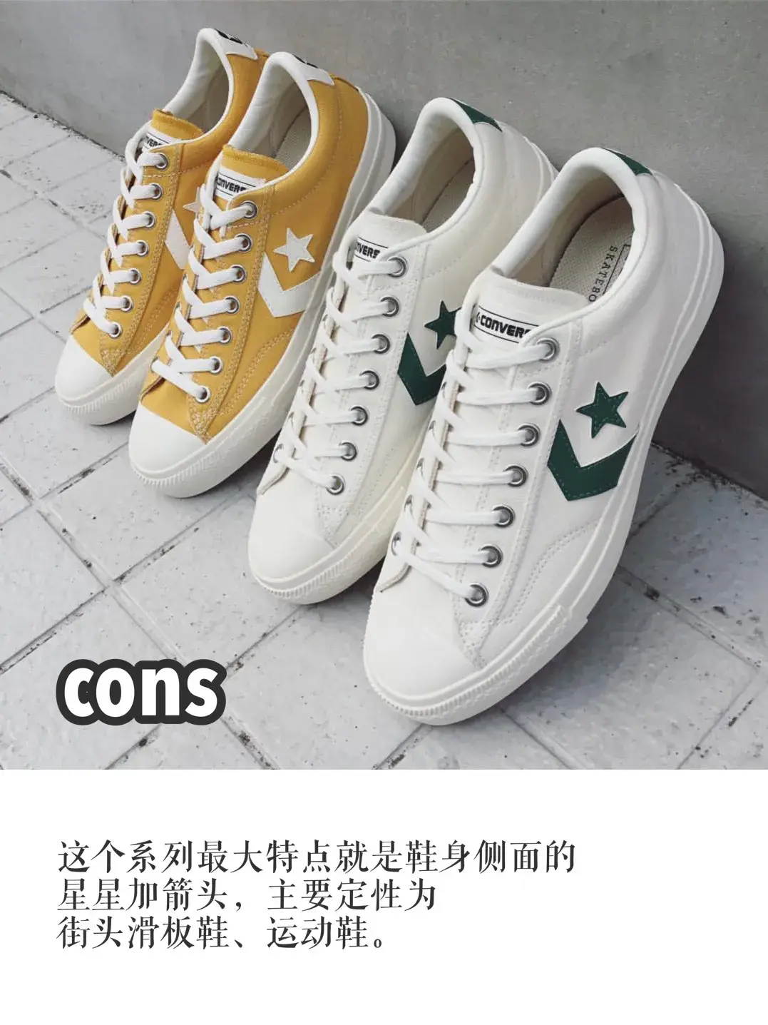 ⑤ cons(星箭),这个系列最大特点就是鞋身侧面的星星加箭头,主要定性为街头滑板鞋、运动鞋。