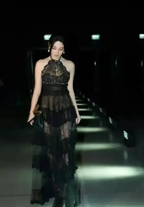 在米兰时装秀上,张雨绮身穿一袭黑色蕾丝连衣裙,展示了她淋漓尽致的完美身材。领口的设计和蕾丝的巧妙运用使整体造型性感而不失优雅。