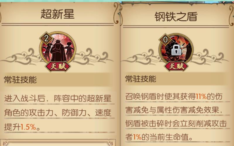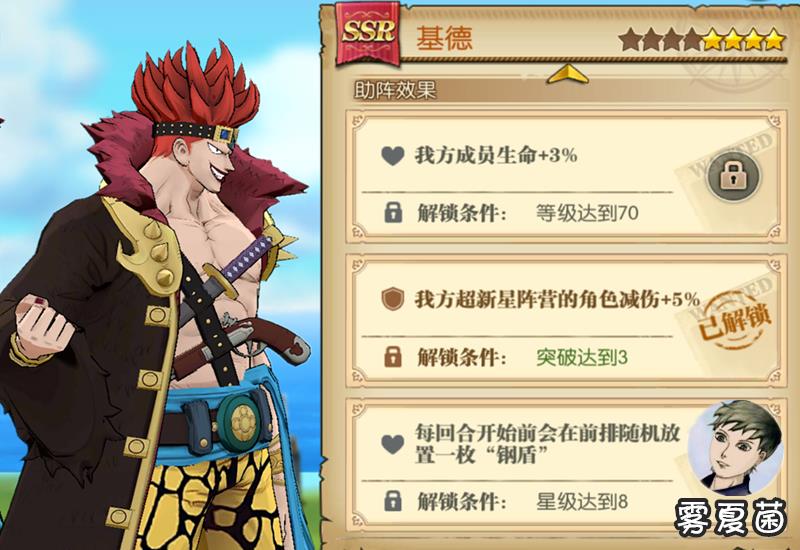 超新星:超新星的BUFF,意味着如果玩超新星阵容,基德是需要尽量得到的角色之一,提升超新星攻击、防御与速度,满级10.5%