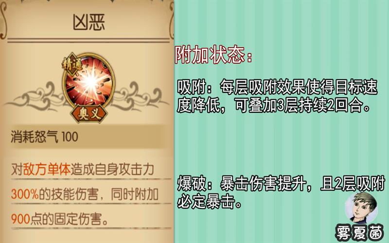 凶恶:奥义单体技能,伤害系数满级300%,附带的状态是吸附与爆破。