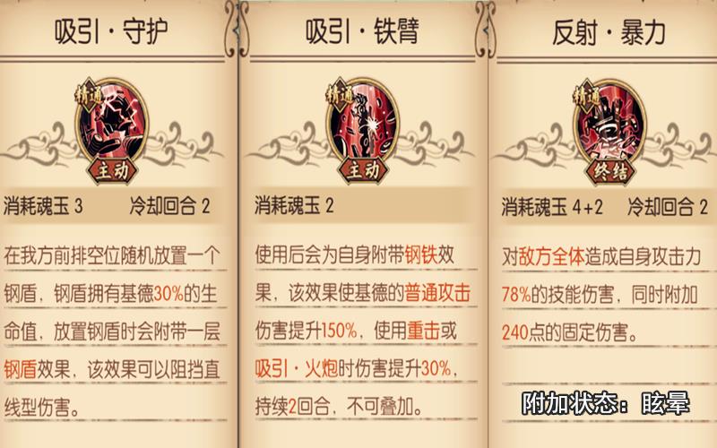 反射·暴力:开状态6魂玉,50级天赋开启后降为5魂玉。全体终结技能,满级伤害系数78%,附带状态是眩晕(对血量最低的目标满级100%眩晕)。