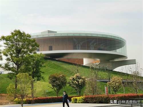 这栋建筑高20多米,通体圆润晶莹,如同一个来自外太空的飞碟,在蓝天之下璀璨夺目。上部是椭圆形展馆,下部是棱面草地,南部是波光潋滟的如意湖,现代与自然融合一起,无论从哪个角度看都无懈可击。