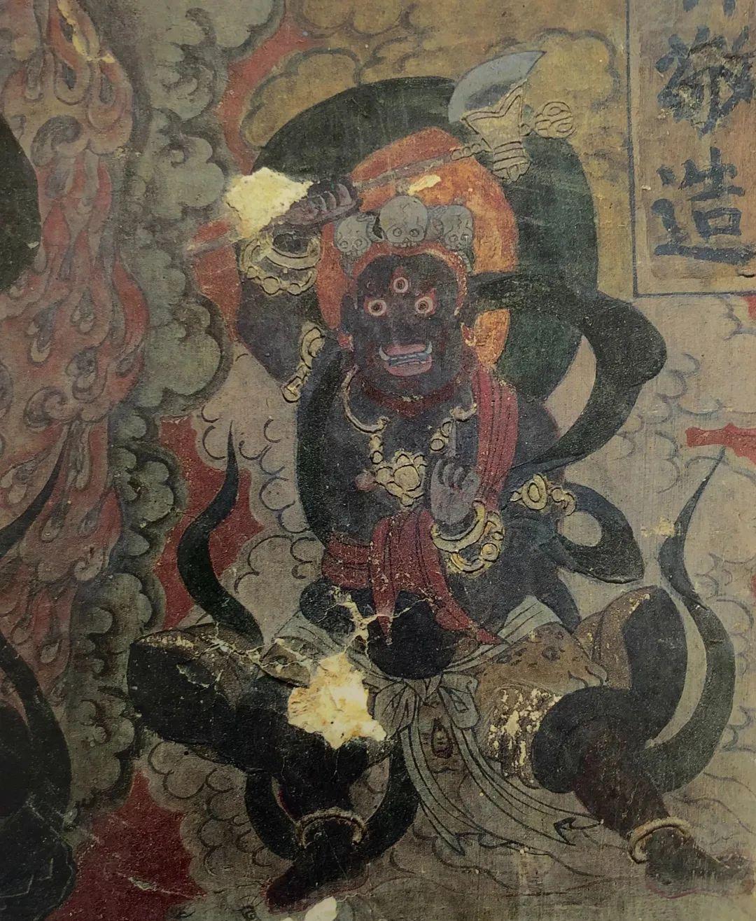 丽江壁画中的大黑天神形象体现出了汉藏两种风格,它们分别指向图像学上的两个源头:其一是南诏时期本土流行的土主大黑天“摩诃迦罗”造像,它属于东南亚造像体系的余脉。其二是蒙元时期中原流行的藏密大黑天“摩诃葛刺”,带有浓厚的藏传佛教美术的特征。