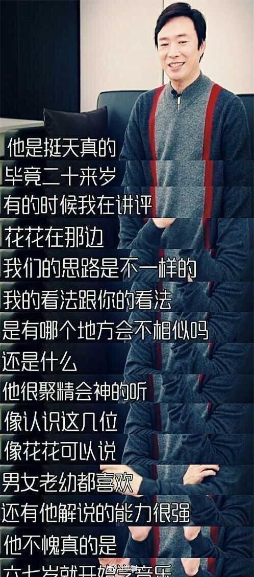 汪峰:我之前在另外的一个音乐节目里面,我当导师的时候,我就接触过不止一次他的作品,我的学员有唱他的歌,所以我那个时候就有了解。他的歌是有水准的,有内容的,像和很多小鲜肉们是同样的一个状态,粉丝也是同样的状态。但是他不太一样的是,他是拥有实实在在的音乐才华和内容的。