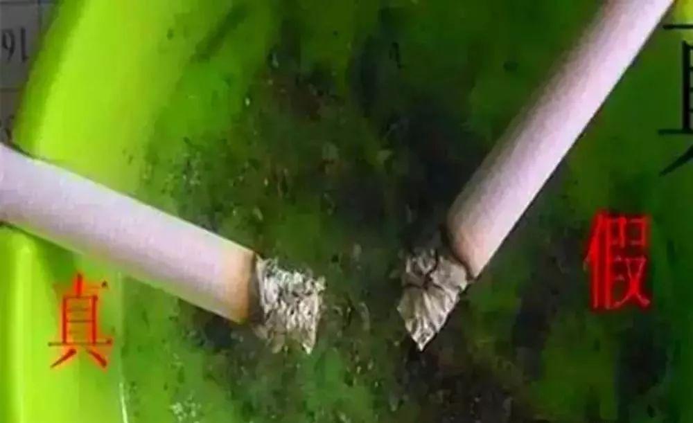 在燃烧中观察烟丝中是否掺杂有较多烟梗冒头,当较多烟梗出现时,香烟就可能有假。