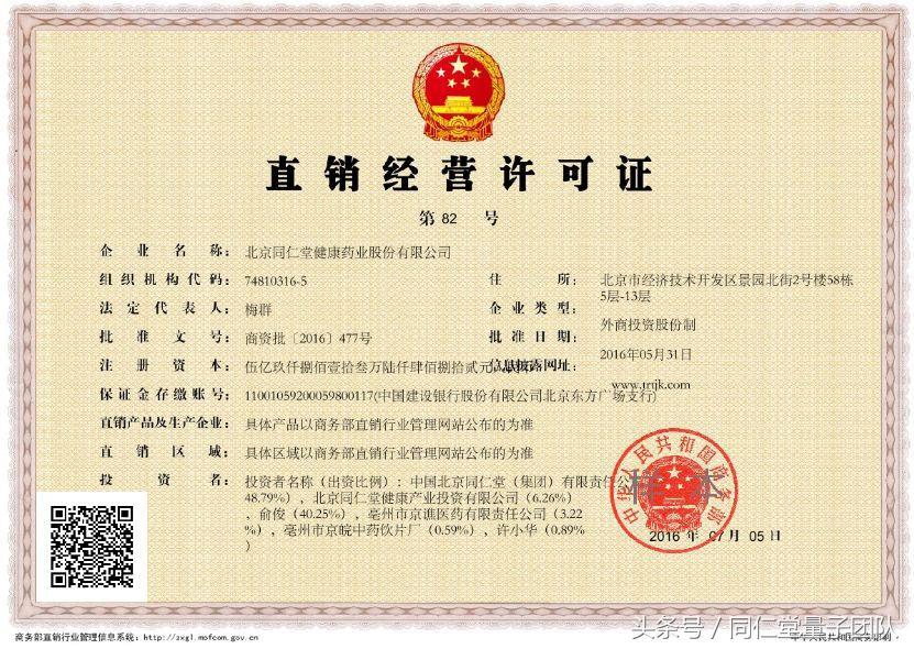 质疑2:同仁堂做直销,有中国商务部颁发的牌照么?