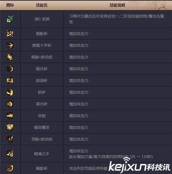 - 当触发初始化效果时,会初始化包含该技能在内的连段技能栏的最终冷却时间。 - 修炼场中使用技能重置按键时会重置正在触发的连段技能栏的冷却时间。 * 黑暗武士最高连段加成变更 - 最高6段变更为5段 - 攻击力增加量:1 - 110%/ 2 - 140%/ 3 - 190%/ 4 - 250%/ 5 - 300% - 由于连段改版,黑暗武士角色技能初始化 2.3.2 黑暗武士技能变更事项