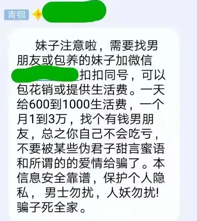 我希望女孩们不要仅仅因为一点金钱就糟蹋了自己的未来。大部分人都是普通人,如果你的家庭条件一般,你所能嫁给的也只是普通人。如果你希望用自己的身体来换取一桶金,为了让将来的生活变得更好一点,或者在之后用这笔钱进行投资和创业,或许我们可以理解你。