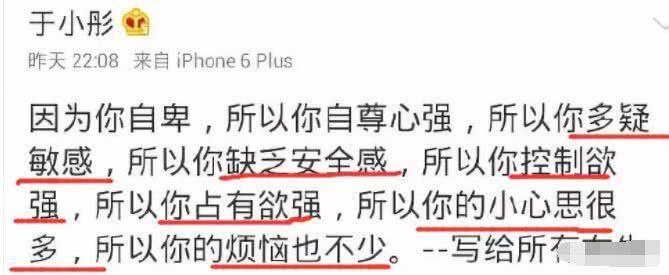 可就在两个人恋情被发现的半年之后,于小彤却在微博上控诉海陆太作妖,直接diss女友也是毫不留情,自尊心强、多疑敏感、控制欲强。
