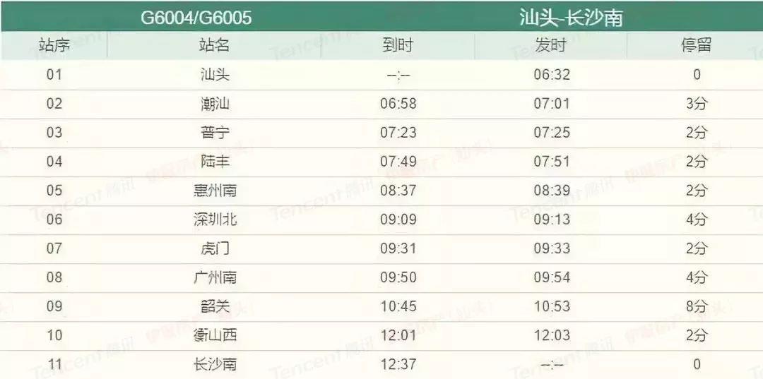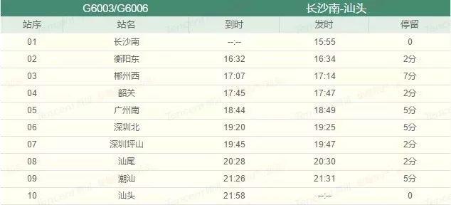 新增加从汕头往返长沙南的高铁1对2趟,车位为G6004/G6005,中间经停站点新增虎门、广州南、韶关、衡山西、衡山东、郴州西站点。