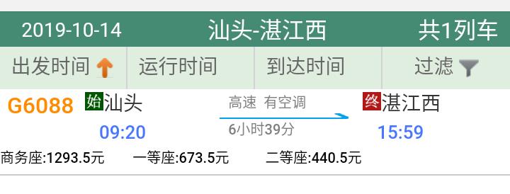 汕头—湛江西:09:20分出发,15:59分到达,全程历时6小时39分;
