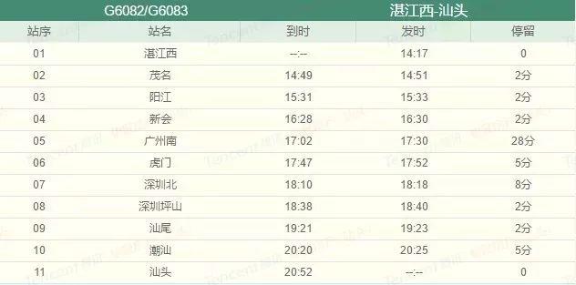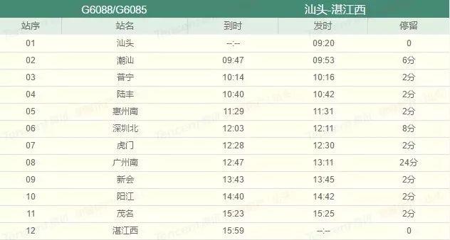 从12日开始,再增加汕头往返湛江的高铁1对2趟,车次为G6088/G6085,中间经停站点新增虎门、广州南、新会、阳江、茂名、湛江西站点。
