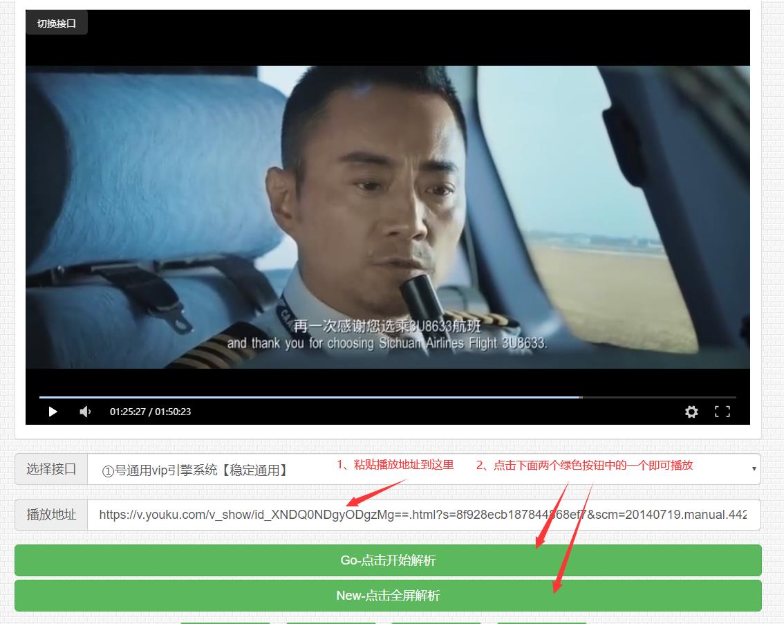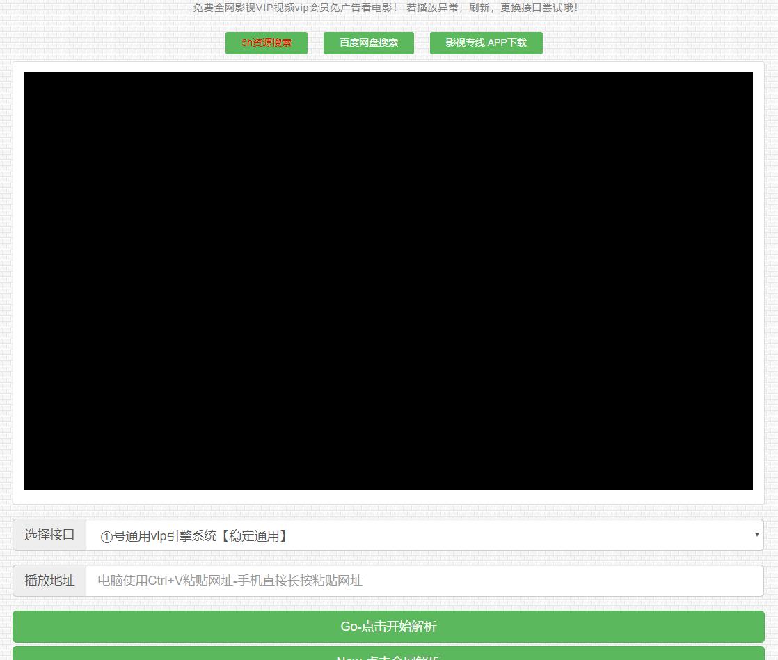4、把复制好的视频播放地址,粘贴到第2步页面中的【播放地址】栏中,点击“Go-点击开始解析”按钮进行播放,如果该接口不能播放,在“选择接口“下拉框中选择其他接口进行播放。