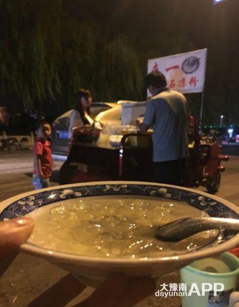 要说这石凉粉,无色无味儿,有什么好吃呢,但它的味道独特也就独特在无色无味上。浅底瓷碗中盛上那么一碗透明见底的石凉粉,舀一勺白糖,再洒几滴薄荷水。浅淡的石凉粉中,白糖的绵甜,薄荷的清凉,全都出来了。什么冰淇淋啊,绿豆汤啊,都没有石凉粉这种晶晶亮,透心凉的感觉。在信阳,只要有冰柜的地方就有石凉粉,一两块钱一碗解渴还解饿!
